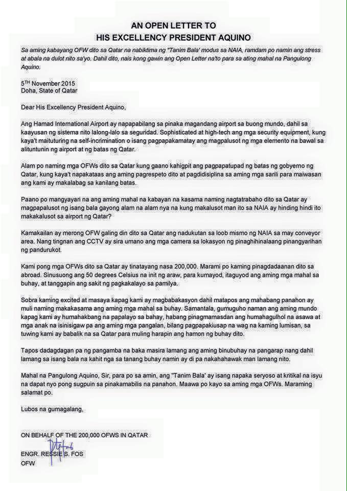 An Open Letter To President Aquino From The Ofws In Qatar When In Manila