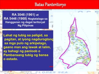 Kahulugan ng Teritoryo. United Nations Convention on the Law of the Sea. Isinaad sa binubuong Saligang Batas na bahagi ng Pilipinas ang mga lupain na may hurisdiksyon partikular na ang mga isla ng Batanes.