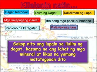 Simboliko - May kauganyan at kasaysayn ng estado 9. Pandaigdigang Batas International Law Ang pag-angkin ng isang teritoryo gamit ang pwersa o anumang marahas. Batay sa 1987 saligang batas ang teritoryo ng Pilipinas ay binubuo ng mga sumusunod.