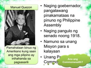 Batas sa Kalayaan ng Pilipinas. Nagpasa ng resolusyon ang Asemblea ng Amerika para sa pagtatag ng isang Komisyong Pangkalayaan 19. Nang Hindi maaprubahan Ang batas-hate-hawes-cuttingtumulak si Manuel L.